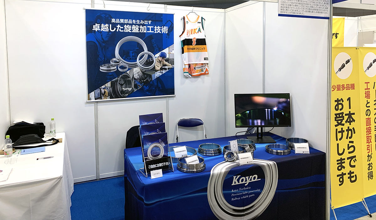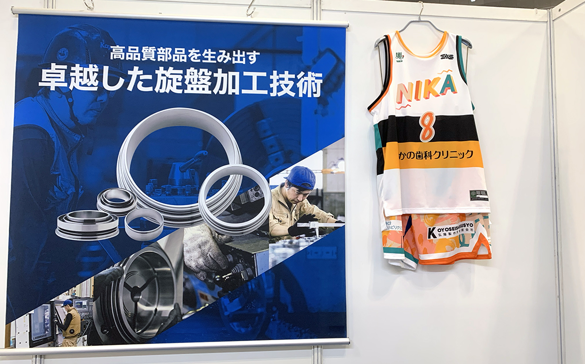 展示会で小ブースの場合は、見せられる情報が多くないので、足を止めてもらえるデザインを意識しています。ビジュアルのインパクトさを前面に出し、弘陽製作所の強みと業種が一目でわかるようにしました。足を止めてもらうことで会社の説明や会話の機会を創出し、実物の加工品をじっくり見てもらうことにつながります。